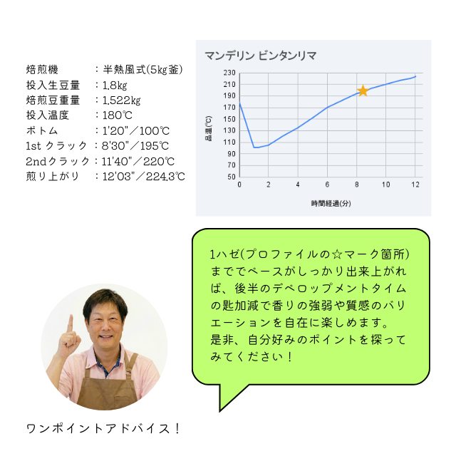 投入はそこそこ高温高火力で行いました。水分抜きがある程度整ったら1分間の温度上昇を10-12℃付近で整えながら1ハゼ手前から少し平均温度を下げハゼを迎えます。マンデリンは特に爆ぜた際の気化熱の影響大きく温度がキュッと下がる現象を経験している方が多いと思います。